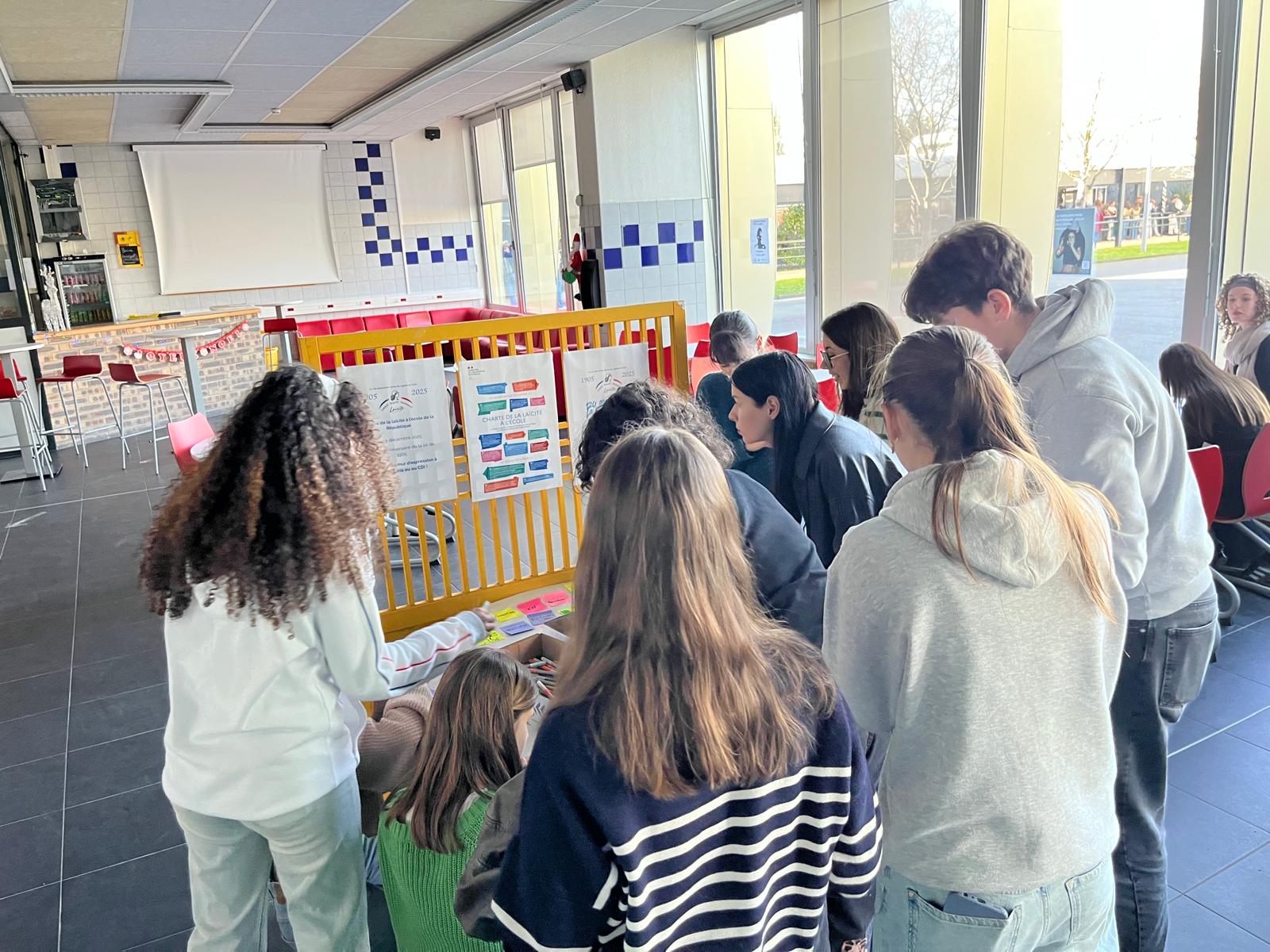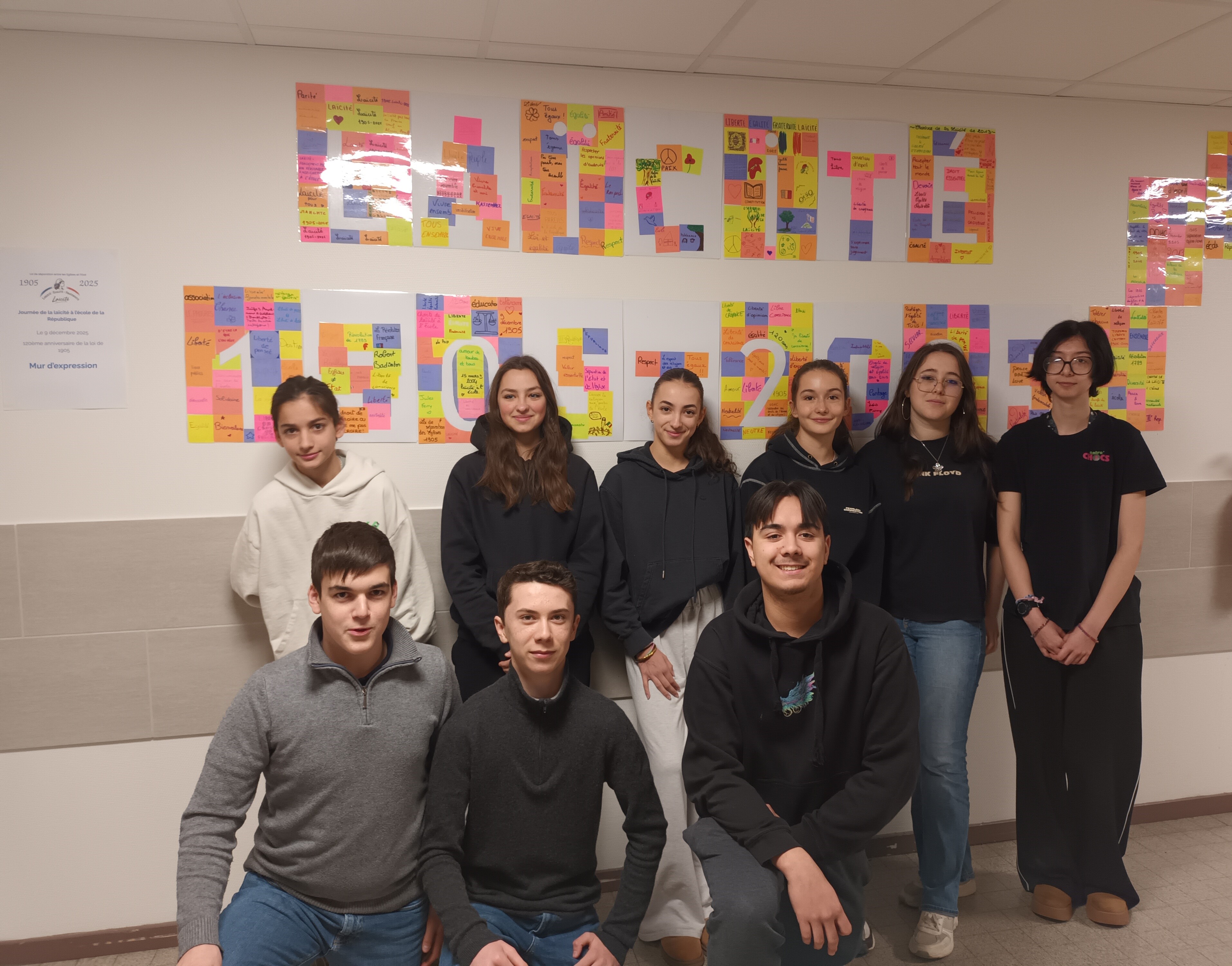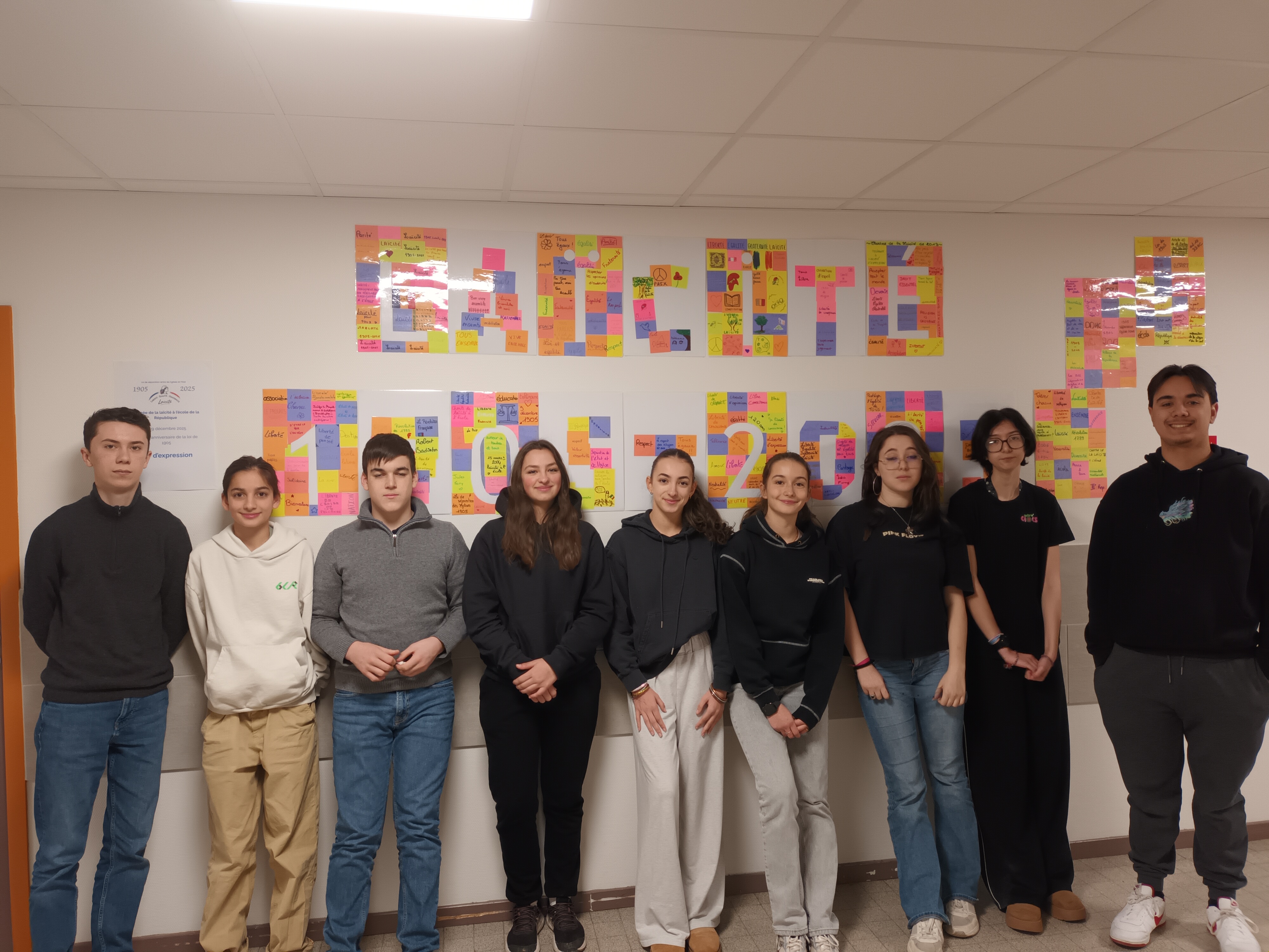 Les élèves de Seconde Section internationale du lycée Madame de Staël encadrés par leur professeure d’EMC, Florence Clément, et Delphine Courmaire, documentaliste, ont finalisé leur projet autour de la laïcité ce vendredi9 décembre. En effet dans le cadre de la journée de la laïcité à l’école et du 120e anniversaire de la loi de 1905, ils avaient proposé à leurs camarades et au personnel éducatif de s’exprimer sur la laïcité, sa signification, son importance… le 9 décembre. Tous les post-its récoltés ont ensuite été triés et assemblés afin de former le mot « laïcité » et les dates « 1905-2025 ». Le résultat final a été affiché dans le couloir du 2e étage près de la Vie scolaire afin qu’il soit vu par le plus grand nombre d’élèves. L’engagement des élèves dans ce projet qu’ils ont mené complètement est souligné par leurs enseignantes. Il révèle combien la laïcité reste une valeur essentielle de notre République.